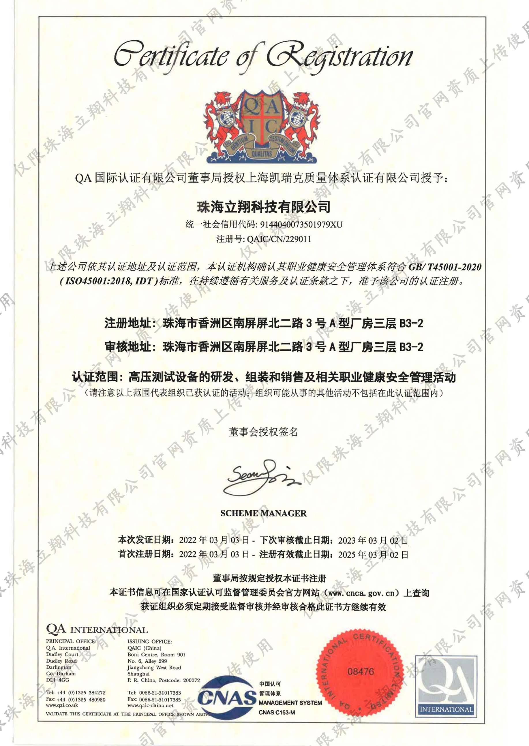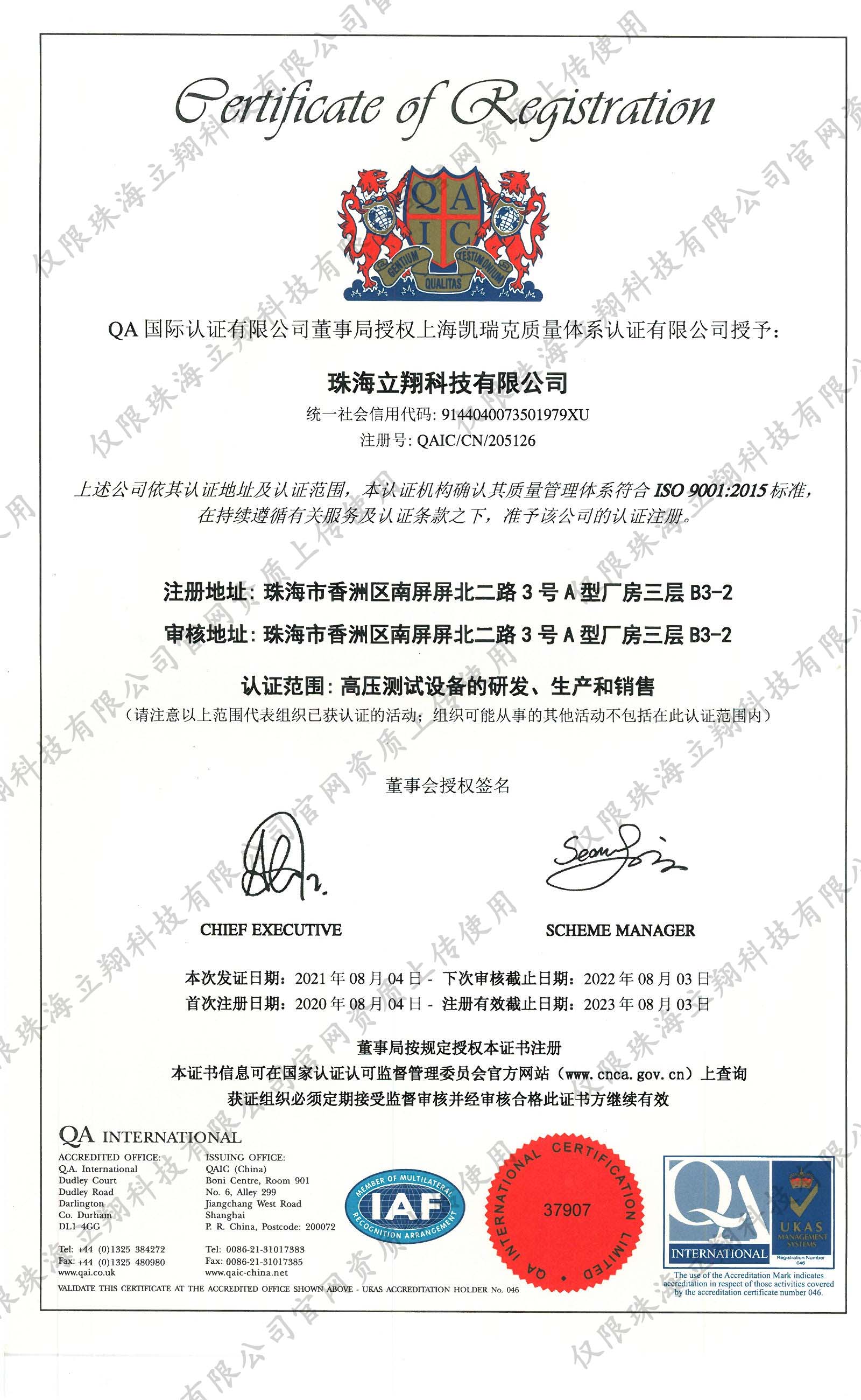 質量管理體系認證證書